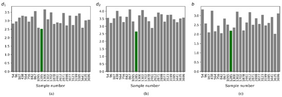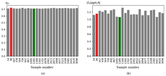 Since we already have a trained ANN model, the prediction of the output features for this large dataset is quite easy. From the predictions, we choose 25 combinations of design features that yield high conversion efficiency. Figure 17 shows the bar plots for conversion efficiency () and non-dimensional significant wave force () at these combinations for a fixed energy period of 5 s. The maximum predicted conversion efficiency is about 0.723 (marked in red) and the corresponding predicted value of significant wave force is 1.15. The significant wave force can be reduced by 8% at another combination (marked in green) and the conversion efficiency for this combination is 0.71, slightly less (1.8%) than the maximum value (0.723). When considering both the structural safety of a bottom-mounted vertical barrier and conversion efficiency as similar weighting, the latter combination can be taken as optimal design features. However, this kind of decision can vary depending on the designer’s preference in weighting.