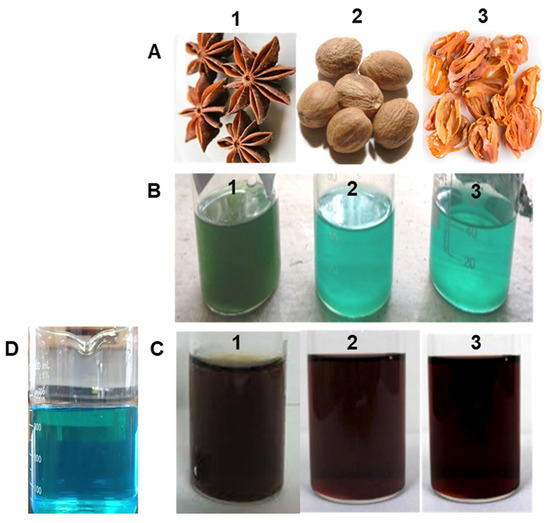 Phyto-formulated biosynthesis of CuNPs. (A) Plant materials of star anise (1), nutmeg (2), and mace (3) used for making extracts; (B) a mixture of copper sulfate and plant extract of star anise (1), nutmeg (2), or mace (3); (C) synthesis of CuNPs with star anise (1), nutmeg (2), or mace (3) and characteristic color change after 24 h of incubation; (D) copper sulfate aqueous solution (control).