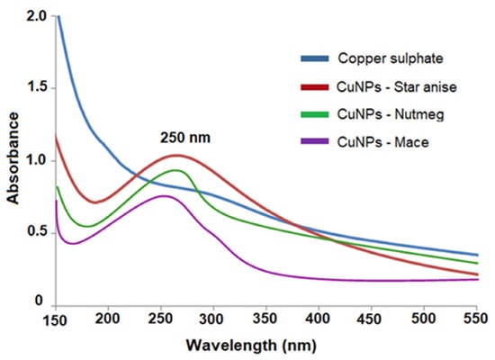 The synthesis of copper nanoparticles was performed by adding copper sulfate solution (CuSO4·5H2O) to the extract at a 1:1 ratio. A color change of the aqueous mixture was observed after 24 h of incubation. Visual confirmation of the color change from the initial color to a brown color was recorded (Figure 1). An increase in the intensity of color with time indicated an enhanced production of CuNPs. In addition, the synthesis was confirmed by UV-Vis spectroscopy with a characteristic peak recorded at 250 nm without peaks recorded between 150 nm and 600 nm for the control (copper sulfate solution), as shown in Figure 2. This showed the reduction of Cu ions to CuNPs with a characteristic peak in the absorption range from 200 nm to 300 nm. In this study, all three test samples (star anise, nutmeg, and mace) showed the existence of a single plasma resonance peak at 250 nm, indicating the synthesis of biogenic CuNPs in the test solution, similar to CuNPs synthesized by using Caesalpinia bonducella seed extract via a green synthetic pathway [6], which also showed the maximum absorption peak at 250 nm.
