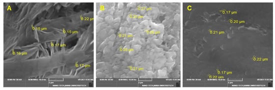 SEM images of biogenic CuNPs prepared with extracts of spices. (A) Nutmeg (150 nm to 220 nm), (B) star anise (210 nm to 270 nm), and (C) mace (150 nm to 220 nm).
