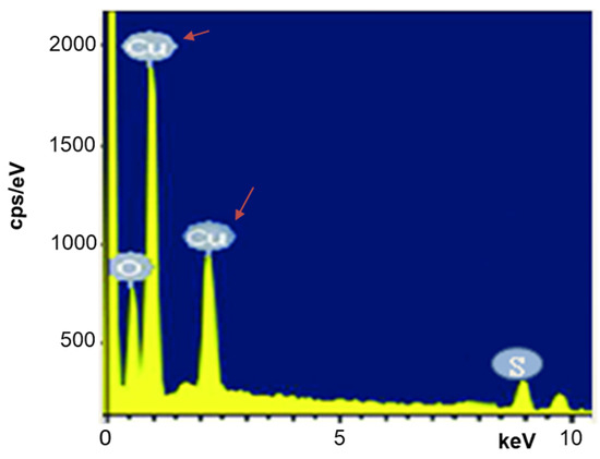 For elemental identification and quantitative composition determination, EDAX analysis was performed. It confirmed the presence of copper (Cu) and oxygen (O) along with a meager impurity of sulfur in trace amounts (Figure 4). All of the three tested spices samples showed the existence of very similar profiles in its elemental composition. Weight compositions of copper (Cu), oxygen (O), and sulfur (S) in these synthesized nanoparticles were found to be 88.20%, 11.78%, and 0.02% by mass, respectively. The stoichiometric fraction of the Cu:O molar ratio was found to be 1.8851, which is very close to 2:1 (molar ratio), proving that the obtained copper nanoparticles were in the form of cuprous oxide (Cu2O), consistent with results of previous studies [27,28]. Recently, researchers have shown increasing interest in finding the mechanism involved in the synthesis of CuNPs with green plant sources. Biomolecules such as flavonoids, proteins, tannins, phenols, and terpenoids in plants have been reported to be good reducing and stabilizing agents for CuONPs synthesis [29]. The existence of phenols and terpenoids in green-synthesized CuNPs with spices was confirmed in the present study. Several studies have discovered that phytochemicals in plant extracts can initially form complexes with ion salts and then reduce ions to form nanoparticles [18]. Biomolecules in plant extracts can usually react with copper ions to cause reduction, which subsequently transforms into copper oxide nanoparticles (CuONPs) [30]. A similar type of reaction was also observed in the present study, where EDAX analysis proved the presence of CuONPs.