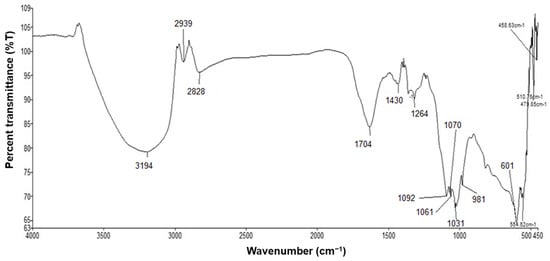 FT-IR spectra attained from green-synthesized nanoparticles of nutmeg (Figure 6) revealed bands at 3194.92 cm−1 corresponding to –OH stretching, proving the presence of carboxylic acid –OH; 2939.39 cm−1 corresponding to the C–H stretching of alkane C–H; 1704.54 cm−1 corresponding to C = O stretching of the ester group; 1430.48 cm−1 corresponding to C–H bending of alkane C–H; and 1264.88 cm−1 corresponding to C–O–C stretching of an ether group. The existence of these functional groups in green-synthesized nanoparticles of nutmeg depicted the presence of esters, alcohols, and phenolic compounds, similar to results of a previous study [36]. In one earlier study, the FTIR spectra on methanolic solvent extract and ethyl acetate extract of Myristica fragrans seeds also revealed the presence of a carbonyl group, alkane group, and ether group as functional groups of biological compounds such as alkaloids, steroids, tannins, flavonoids, phenolics, and glycosides, known to be secondary metabolites with antimicrobial properties [37]. It has been concluded that these functional groups are responsible for their antimicrobial properties [38].
