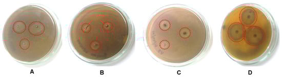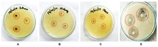 Growth of S. aureus showing zones of inhibition (circled in red) of CuNPs formulated with spice extract: (A) star anise, (B) nutmeg, (C) mace, and (D) gentamycin (positive control) with a well-diffusion method.