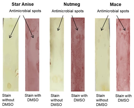 The microbial growth was seen unswervingly on the surface of a TLC plate, eliminating spots of antimicrobials. Antibacterial activities of green-synthesized nanoparticles from spices were perceived by overlaying TLC plates with agar comprising S. aureus and then spraying with tetrazolium salt [87]. Oxidoreductases of living microorganisms can convert tetrazolium salt into a pinkish purple formazan [88,89]. The so-called inhibition zone was a creamy spot appearing against a purple background indicating the presence of antimicrobial agents. It was observed when green-synthesized nanoparticles were tested for antimicrobial activities. This method allowed for the finding of spots of growth inhibition of cultures immediately in the extract. The TLC plate was previously distributed with a broth culture comprising microorganisms [90]. In earlier studies, antifungal activities of nutmeg [91] and star anise [92] have been proven by TLC–bioautography.