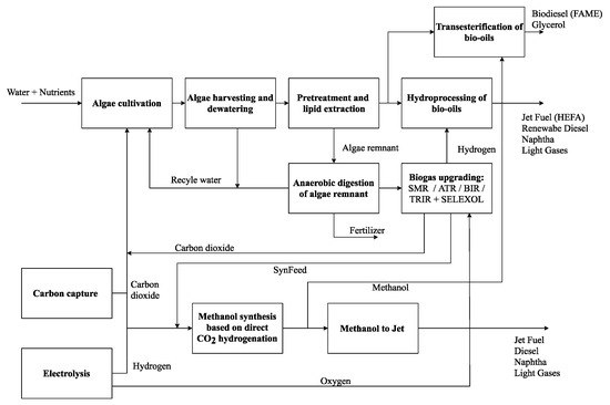 Algae represent an advanced biomass source, with lower land usage and higher productivity as compared with other types of biomass, while not competing with food production [4,5]. It can be utilized for a plethora of products. Algae refineries (see Figure 1) cultivate algae in water using nutrients and carbon dioxide. The produced algae are harvested and dewatered. The biomass consists of a considerable amount of bio-oil, which is separated using solvent extraction (e.g., hexane). These algal oils can be converted to fatty acids methyl esters (FAME), also called biodiesel and glycerol or hydroprocessed esters and fatty acids (HEFA), which are usable as biokerosene. The algae residue, on the other hand, is composed of carbohydrates and proteins and can be used as a feedstock for bioethanol or biogas production [2,4,5]. Biogas has many applications, including electricity and steam generation through combustion and the use of gas and steam turbines. However, biogas can also be employed for the production of pure H2 or a mixture of H2 and carbon dioxide (CO2) (here referred to as SynFeed) or carbon monoxide (CO) (synthesis gas). Synthesis gas or SynFeed, in turn, can be used for methanol production based on conventional or direct CO2 hydrogenation [1].