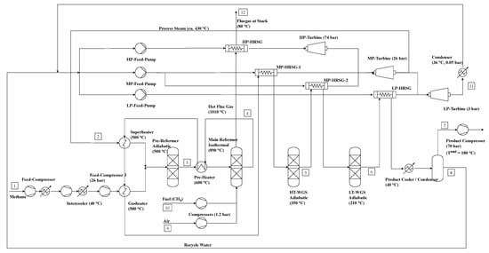The process flow diagram is presented in Figure 3. It is assumed that CO2 is separated from the biogas beforehand, leading to a pure CH4 input. First, this pure CH4 is compressed in a two-stage compression with intercooling to 40 °C. Afterwards the gas feed is pre-heated to 500 °C and mixed with steam at 500 °C to the desired S/C ratio. Here, two different approaches are taken and investigated independently from each other.