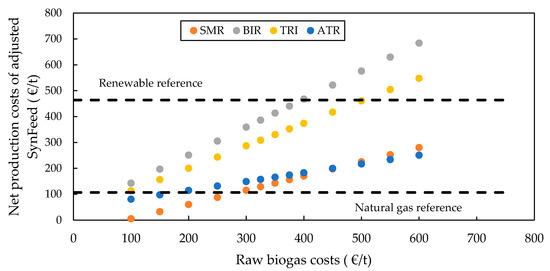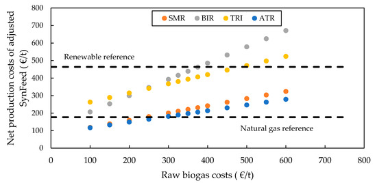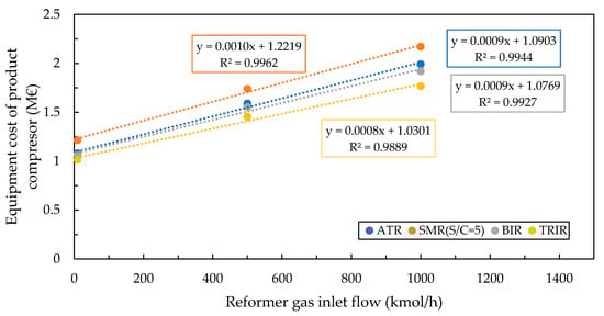 Table 7 lists the calculated purchase equipment costs of the different process designs. Since the product gas compressor to 70 bar is only required if the raw SynFeed is directly fed to the methanol synthesis, the corresponding costs are represented separately. The reformer, as well as the dual water-gas-shift reactor, are calculated using values drawn from the literature and given in Table 8. Base flow rates (FBase), costs (CBase) and sizing exponents (fs) for reference plants are given. The approach is based on economies of scale, as shown in Equation (9) with year-dependent chemical engineering plant indices CECPI [33,34]. The compressor and balance of plant (BOP), including heat exchangers, pumps, turbines and flash evaporators, are derived from the Aspen Economic Analyzer tool. Equipment for steam reforming technologies (SMR/BIR) are more expensive than that of autothermal systems (ATR/TRIR) because they incorporate a more complex heat recovery system.
