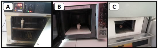 Placement of: (A) Autoclave in the oven, (B) crucible in the microwave, and (C) crucible in the furnace.