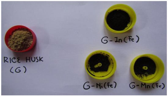 Carbon nanostructures from the biomass of rice husk was prepared using the hydrothermal-microwave pyrolysis method. There was no more conditioning of carbon to reduce particle size before preparation of the composites; thus, the nanosizes were conditioned by hydrothermal and microwave heating. The composites of MFe2O4/CNS were prepared with conventional heating from a mixture of CNS, salts of metal chloride, and KOH. The change of material from biomass to composites is presented in Figure 2.