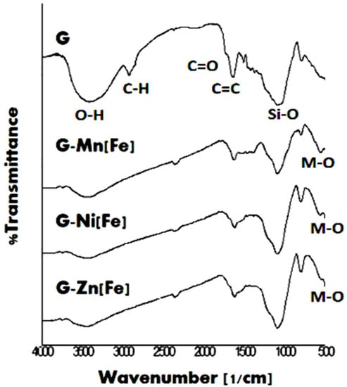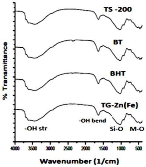 The existence of maghemite is responsible for the presence of M-O in the FTIR spectra bands in Figure 3. Illite[K0,65Al2(Al0,65Si3,35O10)(OH)2] and muscovite belong to a group of clay mineral, i.e., the layered minerals consist of a silicate layer and an aluminate layer. The silicate layers are built by tetrahedron SiO4, held together using oxygen atoms [42]. These silicate layers give Si-O vibrations, which provide a sharp, wide FTIR band at the range of 1000–1050 cm−1.