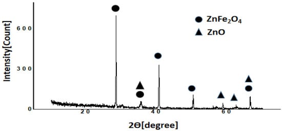 The diffractogram in Figure 4 is compared to diffractograms of standard ZnFe2O4 and ZnO [20]. ZnFe2O4 has data of 2θ (hkl) as follows: 29.9, 35.2, 42.8, 53.2, 56.6, 62.1, and 66.4° connected to (111), (220), (311), (400), (422), (511), (440), respectively, for the reference code of 01-089-4926. The side product of ZnO wurtzite has peaks at 36.3, 56.6, 62.9, and 66.5°, which are related to hkl of (101), (110), (103), and (200), respectively, for the reference code of 01-079-0206. The comparison shows that the composite product contains ZnFe2O4 and ZnO.