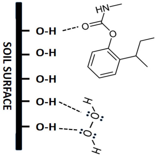 By considering mineral type in soil, including muscovite, illite, and maghemite (result of XRD characterization), which are rich of hydroxides, H2O2 molecules can be adsorbed by the soil through hydrogen bonding. BPMC molecules have C=O functional groups; thus, these molecules can also be adsorbed by soil with the same chemical interaction. This interaction explains the possibility of a competition of adsorption between BPMC and H2O2 by the soil—lower adsorption of BPMC by soil in the presence of H2O2 than without, as shown in Figure 6. Although H2O2 can be ionized in wet soil, the characteristic of H2O2 as a weak acid causes it to mostly exist as a molecule.