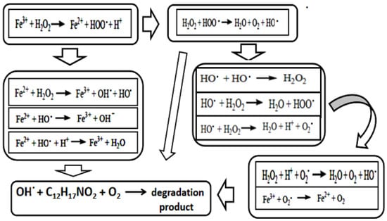 Based on an analogy toward Fenton reactions [32] and by considering the spontaneity of a Fe(III) and H2O2 redox reaction due to positive E°, i.e., 0.07 V [33], the reaction of peroxide acid and Fe(III) on [TG-Zn(Fe)] was used as a starting reaction to form radicals. In the redox reaction concept, E°(Fe3+, Fe2+) = +0.77 V and E°(O2,H2O2)= +0.70 V [33]. The products of Fe(III) and H2O2 are Fe(II) and [HO2]− radical. By considering both products and elementary reactions in the Fenton reaction [32], three possible reaction lines in degradation of pesticides can be designed (Figure 7).