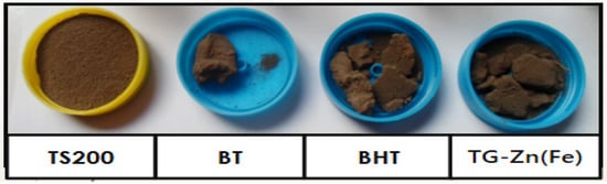 After the dark degradation test, filtration of the pesticide solution was performed to obtain the residues. Pictures of the dry soil and the residue of BT (dry soil-pesticide), BHT (dry soil-pesticide-H2O2), and TG-Zn(Fe) [dry soil-pesticide-H2O2-composite] are presented in Figure 8. The figures of BT, BHT, and TG-Zn(Fe) samples in Figure 8 were taken from one of residues in Figure 7 for drying and taking their photograph. The dry soil was dark brown in colour due to the content of hematite and maghemite. The most common color of hematite and maghemite in soil is moderate reddish brown and dark yellowish brown, respectively [36]. The existence of these minerals in soil is studied by X-ray diffraction.