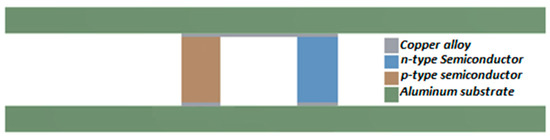 A thermoelectric generator (TEG) is usually composed of two thermoelements connected in series, an n-type and a p-type. Thermoelements are connected by a metal (copper) and sealed by an aluminum ceramic material on the upper and lower surfaces [3]. Various studies on TEGs have studied an extensive field focused on applications, such as automotive, aerospace, industrial, and everyday life [4,5,6]. Normally if a temperature gradient is applied in a TEG system, there will be an electric field in the opposite direction associated with the thermoelectric system. This phenomenon is called the thermoelectric effect [7,8]. Thus, one of the essential factors determining the efficiency of thermoelectric generation is the temperature difference (∆T) between the hot and cold sides of the thermocouple.