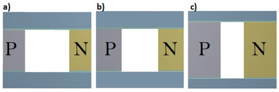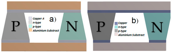 Trapezoidal geometries are also considered to perform the same analysis with the same thermoelectric properties. The diagram of the TEG is shown in Figure 4, which consists of thermoelectric legs of p-type and n-type of trapezoidal shape interspersed between the heat sink and heat source, with a variable surface area. The geometric dimensions, such as the length, thickness, and cross-sectional area, of the p-type and n-type thermoelements are the same. Therefore, the temperature distribution in the p-type and n-type thermoelectric branches will be equal.