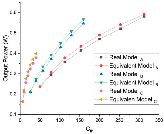 The currents generated for each geometry do not vary much from the real ones; their respective equivalent geometries are shown in Figure 7. Knowing that the thermal concentration ratio is a relation between the substrate area and the area of the thermocouple, according to Equation (4), Cth is an adimensional parameter. The maximum output power for equivalent models A, B, and C is 0.5916 W, 0.5671 W, and 0.3983 W, respectively. The maximum output power for models A, B, and C is 0.5812 W, 0.5474 W, and 0.3781 W, respectively. The output power for commercial models and equivalent models is almost the same; the difference is minimal. An increase in Cth increases Pout, disregarding the type of geometry.
