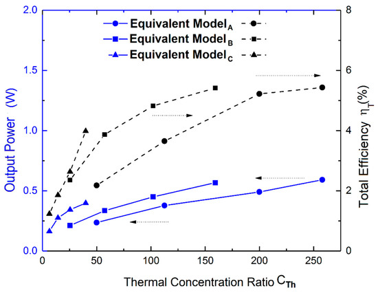Efficiency and output power of the three equivalent models with a different thermal concentration ratio (adimensional unit).