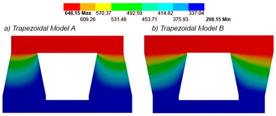 Temperature distribution with convection coefficient of 2000 W/m2K for: (a) Trapeziodal Model A and (b) Trapezoidal Model B.