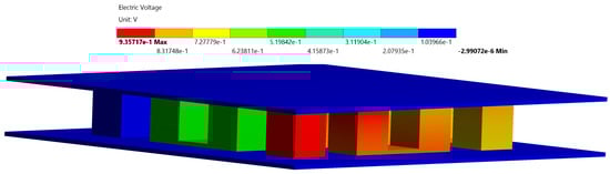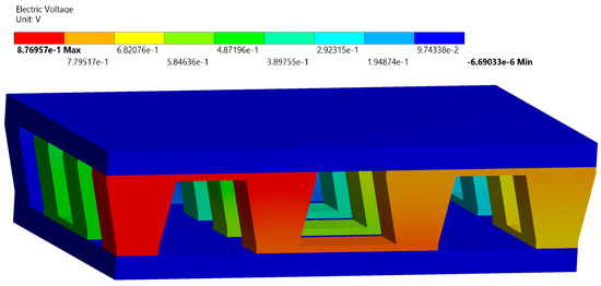 Figure 11 shows three-dimensional electric potential at Re = 1675. The use of nanofluids causes better heat transfer and electric potential differences in the Solar-TEG. The electrical output potential is approximately 0.93 V with water with 0.1% graphene nanoplatelets dispersed as a coolant. The minimum edge length of the mesh is 1 × 10−3 m, and it consists of 19,962 nodes.