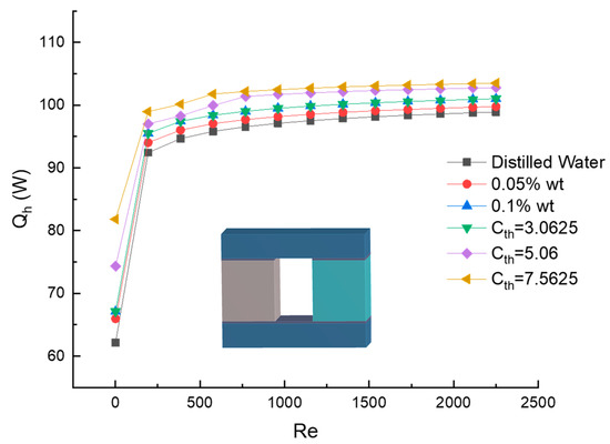The maximum heat with 0.1% wt is 101.01 W, while using distilled water it is 98.89 W. This also shows the heat as a function of Reynolds number but with different concentration ratios, Cth. In that case, the maximum heat at a Cth of 7.5625 and 3.0625 is 102.49 W and 94.37 W, respectively. Those results are with 0.1% wt.