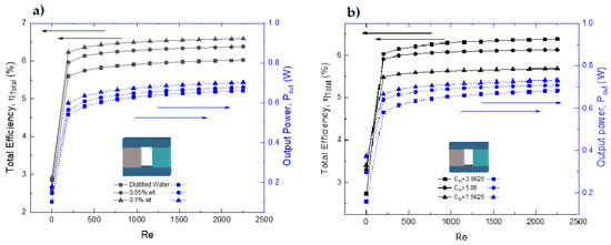 (a) Efficiency and Pout vs. Reynolds number of equivalent model B with distilled water and graphene nanoplatelet nanofluids at different concentrations. (b) Efficiency and Pout vs. Reynolds number of equivalent model B with different concentrations ratios at 0.1% wt of GNAN.
