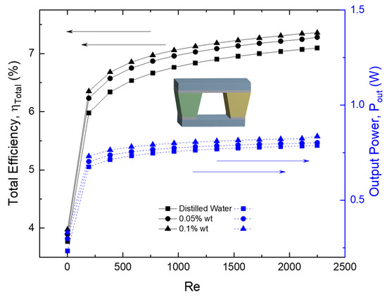 Selimefendigil and Öztop [33] evaluated the efficiency of the TEG module located between two channels, carbon/water nanotubes flow with combined effects of particle inclusion, and flow pulsations, and with a Re = 250–1000, mass fraction of 0.01 and 0.04% wt, Strouhal number = 0.01–0.1, and amplitude = 0.25–0.95. When nanoparticle mass fraction, Re, flow pulsation, and amplitude rose, the efficiency improved.