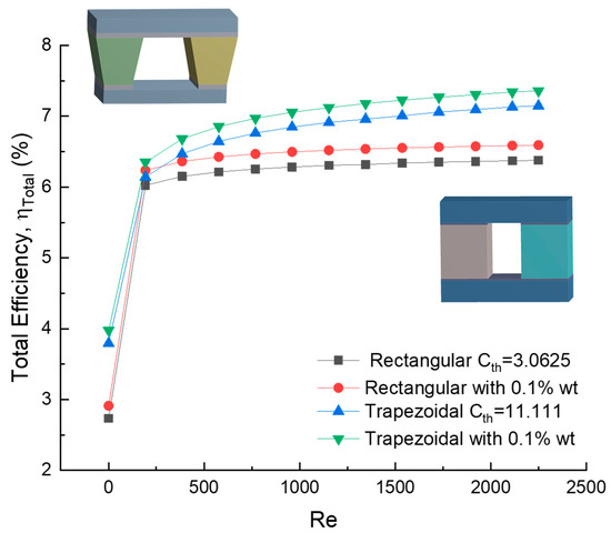 Total efficiency vs. Reynolds number of trapezoidal model B and rectangular model B with concentration 0.1% wt and two different thermal concentration ratios.