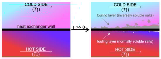 In Equation (1), h and A are the heat transfer coefficient and the heat transfer area of the heat-exchanging fluids (subscripted with 1 and 2), respectively, while Rwall is the thermal resistance of the wall, separating the two flows. Fouling resistance Rf comes from the deposit, which accumulates on one or both sides of the separating wall, depending on the conditions present in the heat exchanger (Figure 1). The term can be classified as the difference between reciprocal values of overall heat transfer coefficients prior to fouling (Uc) and after fouling occurs (Uf) such that:
