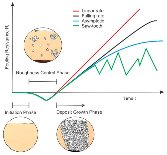 The term asymptotic fouling resistance is obtained, which denotes a maximum value of fouling resistance where the deposition and removal mechanisms are in equilibrium. Generally, an S-shaped curve with several distinct regions can be observed, like the one presented in Figure 2 or in [17,18], once the asymptotic fouling resistance is reached. Although the model was criticised and improved over the years, the basic principle remains valid and is the foundation upon which most research is conducted. The growing deposit is also subject to aging, which can either strengthen or weaken it over time, and is one of the least understood and studied phenomena of fouling [19].