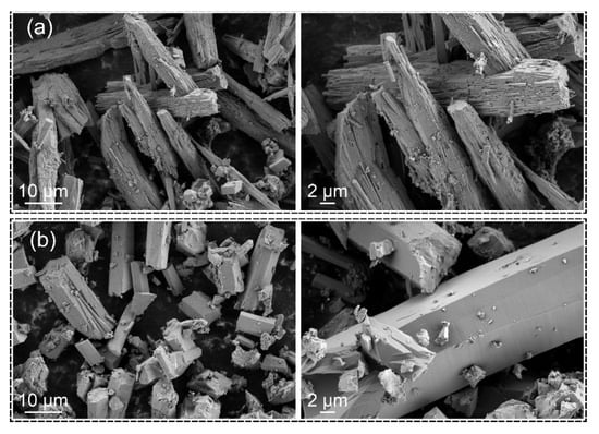 SEM images of calcium carbonate deposits: (a) calcite and (b) aragonite.
