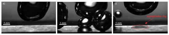 Crystallization fouling is more severe if boiling is present because of bubble formation mechanisms, which can increase the local salt concentration near the heat transfer surface by several orders of magnitude. The transition into nucleate boiling can sometimes be caused by the fouling process itself because of increasing surface temperatures as a result of the formed deposit, as shown by Abd-Elhady et al. [63]. They studied the effects of CaSO4 crystallization fouling and conducted several experiments at constant heat flux conditions that have shown an increase in surface temperature above boiling point because of scaling, leading to nucleation of bubbles. The bubbles would then speed up the deposition process, as the local foulant concentration increased due to evaporation. Boiling was reported primarily after the induction period, when first deposits can be seen and would stop abruptly, when the whole surface was covered and the steam chimneys between neighbouring deposits were closed. Malayeri et al. [64] investigated fouling of tube bundles under boiling conditions and reported a significant effect of bubble agitation on salt deposition. They stated that bubble formation during boiling acts both as a fouling accelerator by increasing the local foulant concentration and as an inhibitor by increasing shear forces on the walls. Peyghambarzadeh et al. [40] considered the effects of bubble formation on both crystallization and particulate fouling. The former was found to be enhanced by boiling, while the latter was retarded by the strong bubble-induced turbulence near the boundary layer. They also report a contradicting role of fluid velocity depending on the controlling mechanism of fouling. Similar results regarding flow velocity were found during subcooled flow boiling as well [65], i.e., during subcooled boiling at lower surface temperatures, flow velocity promotes fouling and hinders it at high surface temperatures. Dash et al. [66] are among the few research groups that conducted fouling experiments on thin metal foils, under pool boiling conditions. This allowed them to utilize simultaneous high-speed optical and infrared imaging of crystallization under a single bubble, resulting in observations about the dominant role of microlayer evaporation on crystallization during boiling. The group proposed a change in surface wettability as an effective mitigation strategy during boiling of salt solutions—among the tested surfaces, hybrid patterned byphillic ones exhibited the most noticeable improvement. Figure 7c) displays a commonly observed ring pattern of crystallization, appearing on the surface at active nucleation spots. The scale was observed to eventually cover the whole surface, after which the thickness of the layer continued to increase, with portions of it being broken off at random intervals due to forces induced by bubble detachment.