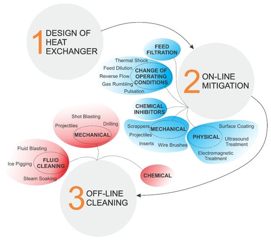 Since fouling (especially crystallization fouling) has such a severe effect on heat transfer equipment, effective mitigation and/or cleaning strategies are necessary to preserve suitable equipment capabilities throughout its lifespan. Figure 8 shows various ways to tackle fouling in heat exchangers, from the initial design to off-line cleaning. The selection of one or more of these strategies generally depend on the type and material of the equipment, severity of fouling, fouling mechanisms, operating conditions, induced costs and desired results [100].