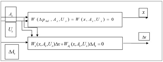It was numerically tested that, in domain Ω and for the drops observed in reality, that is, for x∈(0, 5000) [Pa], the derivatives of polynomial (10) after x do not equal zero. At the determined point in domain P = [x0, As0, Us0], the derivative of the function defining an explicit form of variable x relative to the parameters composing vector As is expressed by the following formula: