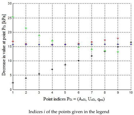 Sensitivity analysis of the vacuum drop model was performed with the use of formula 16. The values of differential Δx(As0, Us0, Qm) referred to the values of drops x(As0, Us0, Qm), and are expressed as a percentage. The sign of the differential indicates the direction of changes, while its absolute value shows the strength of the impact of the change in parameter Asi on changes in value x at point (As0, Us0, Qm). Quotient is often used as a measure of model sensitivity. In this paper, ten percent changes in the parameters were analysed. The analysis of the results presented later in the paper will concern the expression The sensitivity of model (9) was tested for points from the allowable set Ωs (12).