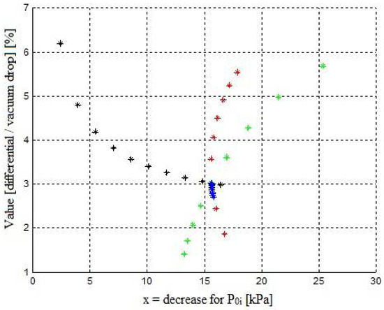 - A decrease in air flow reduces sensitivity (Figure 5, red colour); the course of vacuum drops as a function of inlet air flux (Figure 5, red colour), which indicates the existence of flux Ω*pi at which the drop is minimal (approx. 15 kPa in the diagram), and the sensitivity of the model around that point is approx. 3%;