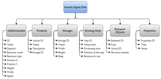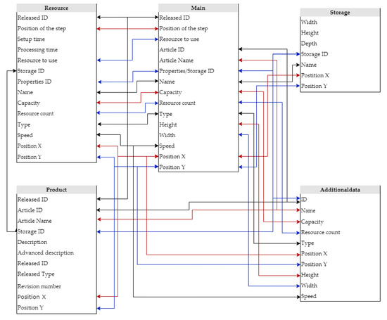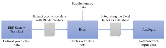 The generic simulation is based on a multi-method model. It uses two modelling methods that complement each other: agent-based modelling (ABM) and discrete-event modelling (DEM). DEM is responsible for routing agents in the simulation. It handles the work steps and decides, for example, which resource has to be approached next, and it is also used for statistical evaluations. With ABM, processes such as the parameterisation of resources (e.g., transporters, workstations) are done. ABM has an advantage in that all essential parameters can be found bundled in the respective agent. Likewise, the representations of resources, warehouses, and products are defined via the respective agents of ABM. The generic AnyLogicTM simulation model requires six input data sets to build and parameterise the model. These data are to be extracted from the ERP system TransfactTM. A variety of information is available within these data sets, some of them required for the generic simulation model. All necessary production parameters can be seen in Figure 3. These include the respective IDs of the data records for unique identification and assignment, such as the article ID. The names of the data sets are specified by TransfactTM and are processed accordingly in the generic model.