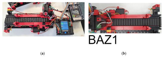 2D visualisation of Learning Factory 4.0 with a suitable image: (a) Workstation 1 (BAZ1) in reality; (b) Workstation 1 (BAZ1) in the visualisation of the simulation model.