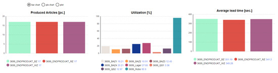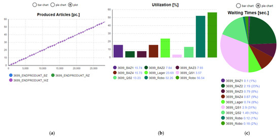 The generic simulation uses KPIs to evaluate the considered production system. For this approach, the generic simulation provides predefined KPIs in a configurable display. The user can choose among numerous statistical evaluations, which can be selected in any combination. For specific KPIs, one can also choose among different diagram types for display. For example, when displaying the individual utilisation of resources, only a bar chart is available. On the other hand, the users can choose among a bar chart, a pie chart, or a plot for the KPIs in the presentation of produced articles. Figure 6 shows an overview of the available diagram types. In (a), the number of items produced is shown in a plot, while (b) shows the utilisation of all resources in a bar chart. Finally, the waiting times of the respective resources are represented in a pie chart in (c). For KPIs, multiple chart types are useful, and the desired chart type can be selected via radio buttons.