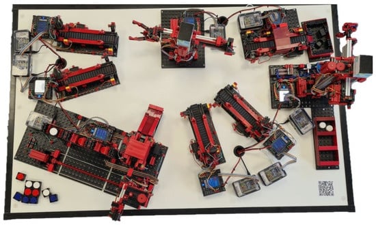 The FTPS has been realised through student projects at the University of Applied Sciences Emden/Leer [62]. It consists of modules from the Fischertechnik construction kit (see Figure 7). The individual modules are connected to a Raspberry Pi via the Fischertechnik PLC (the TXT controller). The individual modules of the system (workstations, transport robots, warehouse) are implemented as a job shop production system. The resources act autonomously and independently of one another. The FTPS is a laboratory setup with an incoming warehouse, an outgoing warehouse, four machining centres, a quality inspection centre, and three robots for material handling (see Figure 7). Three different products (white, red, and blue cylinders) are produced in the production system. These are processed in a predefined product mix. Each of the products uses two of the four machining centres, with no product sequence being the same [62].