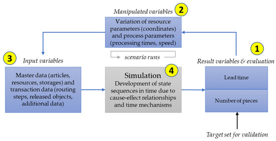 The variables combined with the input variables represent the input data for the simulation. The input variables include, e.g., the order data, certain master data, and transaction data of the production. With these data, the production can be simulated. Afterward, the results of the simulation have to be compared with the result variables and simulation goals. If they do not match, the simulation must be rerun with other input variables. This cycle continues until the targets are reached. Such an optimisation cycle still works in a complex production environment with many variables and change possibilities, where analytical methods quickly reach their limits [1,31,32].
