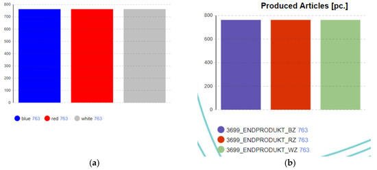 Another comparative value is the number of units produced per article type–the production efficiency. This is measured in the simulation at the end of the process chain by counting up the associated variable per manufactured article. A simulation time of 105 h was selected to obtain meaningful values and identify any differences in the number of units produced. This time results from the time for a production week, i.e., three shifts with seven hours each on five working days.