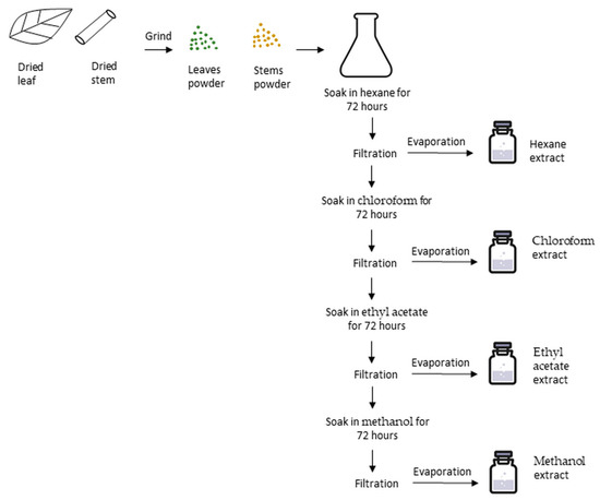 Steps of plant extraction from Strobilanthus crispus leaves and stems. Dried leaves and stems were separated, crushed into fine pieces and then ground into powder form. The extraction was performed by mixing 500 mL of the first solvent into 100 g of powdered leaves or stems, and then macerating in the dark at room temperature for 72 h. The suspensions were filtered and then evaporated to obtain the first crude extract. The residues were then macerated in the second solvent and the processes were repeated to obtain the second extract. Eventually, the extracts obtained were as follows: leaf hexane (LH), leaf chloroform (LC), leaf ethyl acetate (LEA), leaf methanol (LM), stem hexane (SH), stem chloroform (SC), stem ethyl acetate (SEA), and stem methanol (SM).