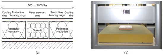 The thermal conductivity was measured through the guarded hot plate method (Figure 1) for the considered mixture on three temperature levels (i.e., 10, 25, and 40 °C). Subsequently, the thermal conductivity of the dry material at 10 °C was extrapolated. The present test was carried out according to both DIN EN 12667:2001 [38] and ISO 8302:1991-08 [39].