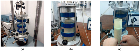 The mechanical behavior was analyzed by performing Uniaxial (UC) and Triaxial (TC) Compression tests on cylindrical samples. For this purpose, a Tritech 50 kN testing machine from Wykeham Farrance (Figure 2a) was used. Tests were performed under displacement control and by adopting a displacement rate of 0.30 mm/min. In the case of the TC tests, uniform water pressure was applied to the samples, which were previously sealed inside a latex impermeable sleeve (Figure 2b,c). After the target confinement pressure was achieved, a uniaxial force was mechanically applied. Piston vertical displacements were obtained through a linear potentiometric transducer, with 25 mm travel placed at the head of the cell, as can be observed in Figure 2a.