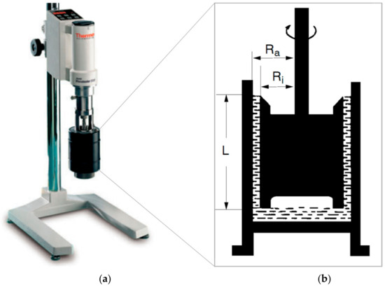 HAAKE Viscotester 550 employed for the rheometric tests: (a) device and (b) sample details (L = 60 mm, Ri = 20.04 mm, and Ra = Ri + 0.96 mm).