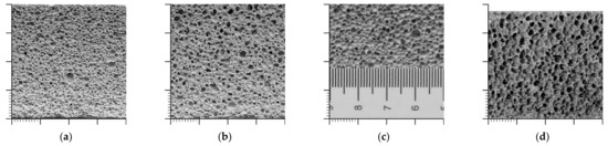 Four foam classes, presented in Figure 4, were recognized in this experimental activity. In this regard, the following observations can be made: foam class A had similar characteristics as B, but with larger maximum bubble diameters (approximately 1.5 mm, see Figure 4b). Foam class B showed a homogenous pattern of uniformly distributed macro-pores with a maximum diameter of approximately 1 mm (Figure 4a).