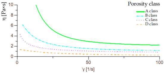 The assignment to the respective groups was only based on the pore pattern. In principle, the proposed class classification does not unconditionally coincide (or is not directly correlated) with the water-to-cement ratio value. The cement used and thus the setting speed was the same in each case. In fact, the mixing energy applied had a more significant effect. For the continuous foam phase of the classes shown, the flow curves were therefore determined in separate tests. The determined sets of curves are approximated in Figure 5 according to Cross [42]. Clear differences in the viscosity levels of the groups can be seen. On this basis, it appears possible to generate a specific pore class under viscosity control.
