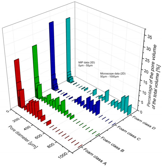 Pore size distribution for the foam classes A to D (as in Figure 4) ranging from 0 to 1000 µm.