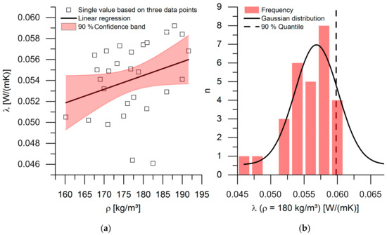 (a) Measured thermal conductivities (average sample temperature at 10 °C) vs. the density of dried cementitious foams; (b) normal distribution of the parallel shifted values along the regression function.